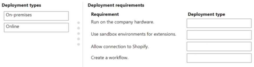 Which deployment types should you use? To answer, move the appropriate deployment types to the correct requirements. You may use each deployment type once, more than once, or not at all. You may need to move the split bar between panes or scroll to view content.