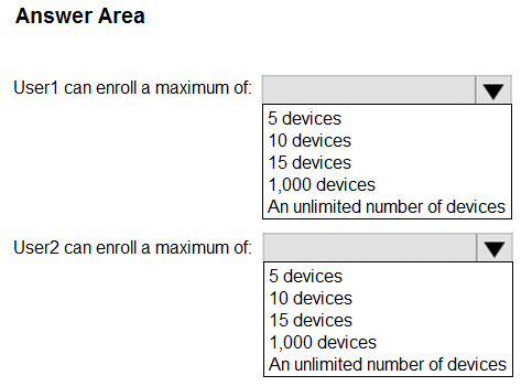 What is the maximum number of devices that User1 and User2 can enroll in Intune? To answer, select the appropriate options in the answer area.