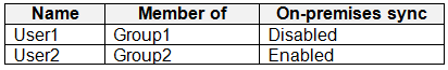 Your network contains an on-premises Active Directory Domain Services (AD DS) domain that syncs with an Azure AD tenant. The tenant contains the users shown in the following table.