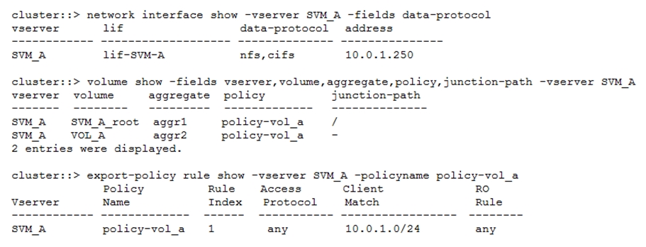 A Linux host with the 10.0.1.24 IP address is unable to mount the VOL_A volume using NFSv3.