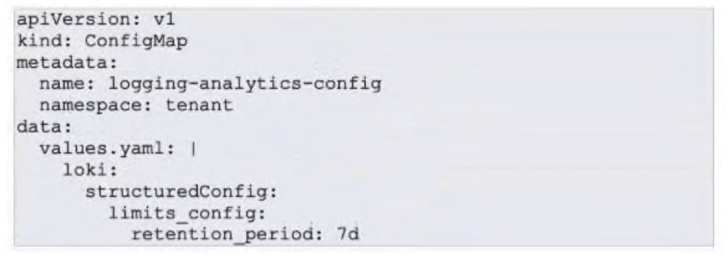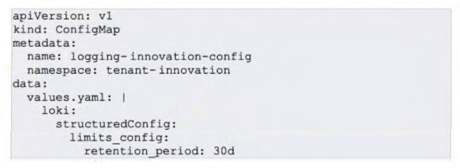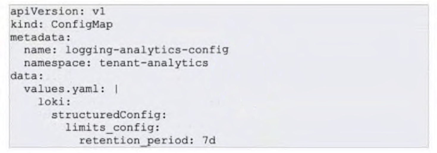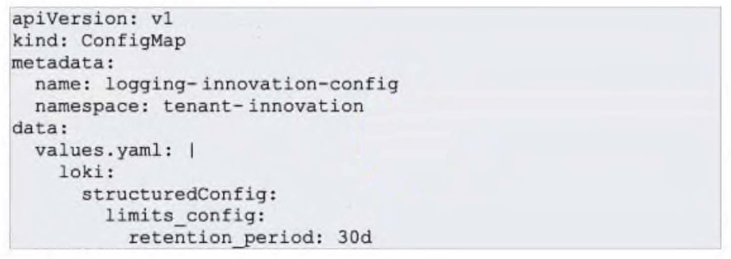 Initially, two namespaces have been configured for each project, as shown in the exhibit. Then a ConfigMap has also been configured for each tenant, which contains the logging configuration.