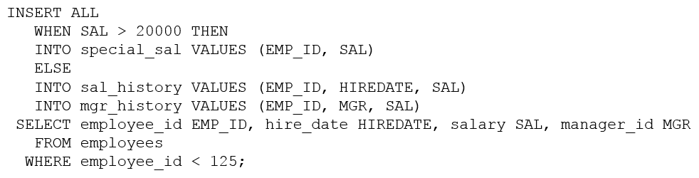 AOnly if the salary is 20000 or less and the employee id is 125 or higher, insert EMPLOYEE_ID, MANAGER_ID, and SALARY into the MGR_HISTORY table.