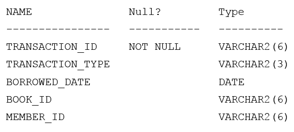 Examine the description of the BOOKS_TRANSACTIONS table: