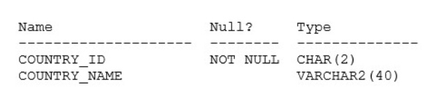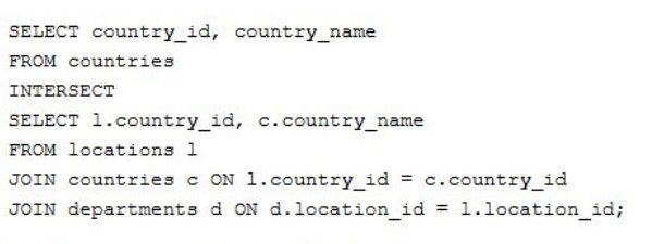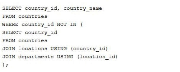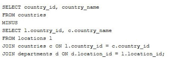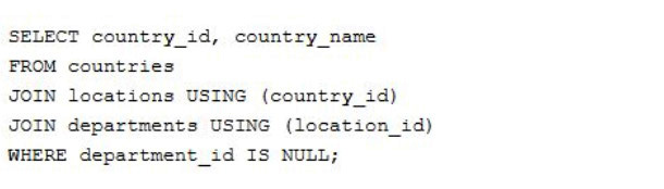 Which two queries will return a list of countries with no departments? (Choose two.)