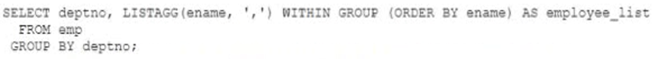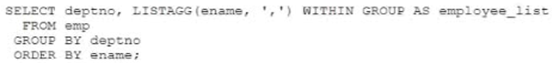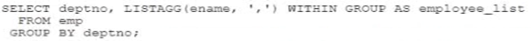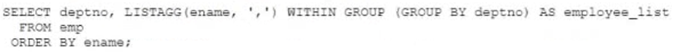 Which statement will return a comma-separated list of employee names in alphabetical order for each department in the EMP table?