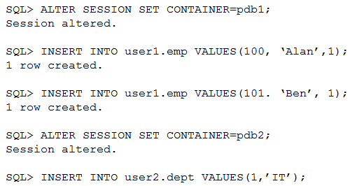 EThe inserts on USER1.EMP were rolled back when the session connected to PDB2.