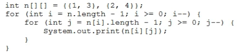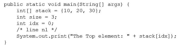 Which two code fragments, inserted at line n1 independently, print The Top element: 30