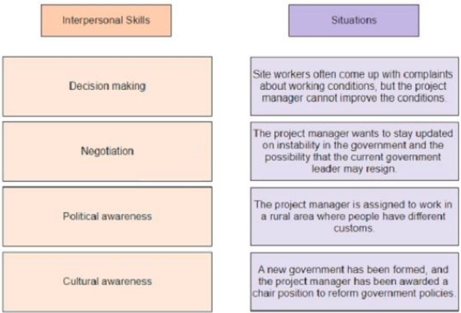 A project manager for a government organization often deals with stakeholder engagement issues. Drag the interpersonal skill the project manager should use on the left to the correct situation on the right.