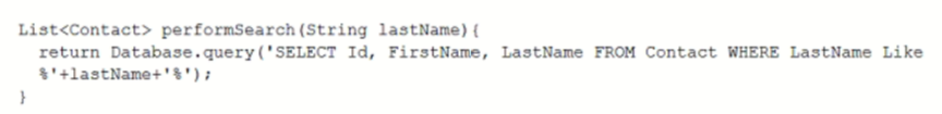 A developer is tasked to perform a security review of the ContactSearch Apex class that exists in the system. Within the class, the developer identifies the following method as a security threat: