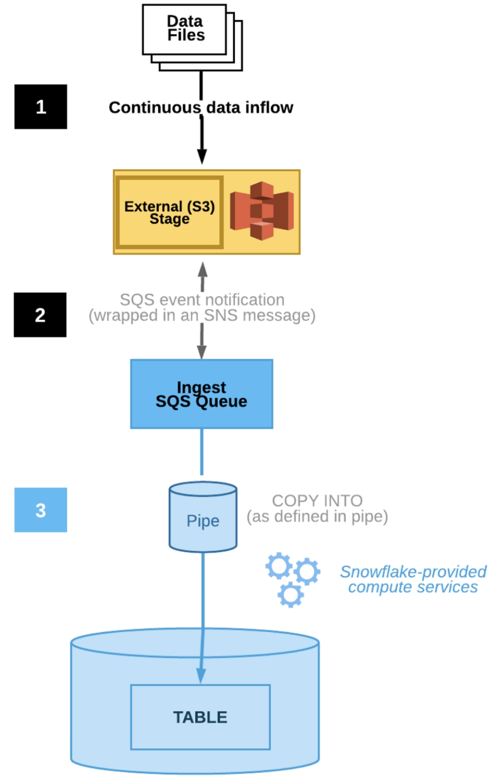 Step 2: An Amazon S3 event notification, published by SNS, informs Snowpipe — by way of Amazon Simple Queue Service (SQS) - that files are ready to load. Snowpipe copies the files into a queue.