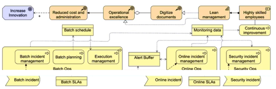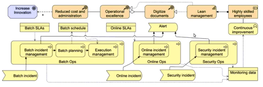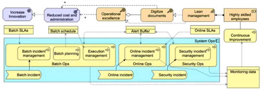 The IT Operations (IT Ops) department at ArchiSurance has five core responsibilities, each encompassing a dedicated business process: (1) Batch Operations (Batch Ops), (2) Online Operations (Online Ops), (3) Security Operations (Security Ops), (4) User Support and (5) Continuous Improvement. Service level agreements (SLAs) are in place for Batch Ops and Online Ops, and each Ops process generates monitoring data that is utilized by the Continuous Improvement process.