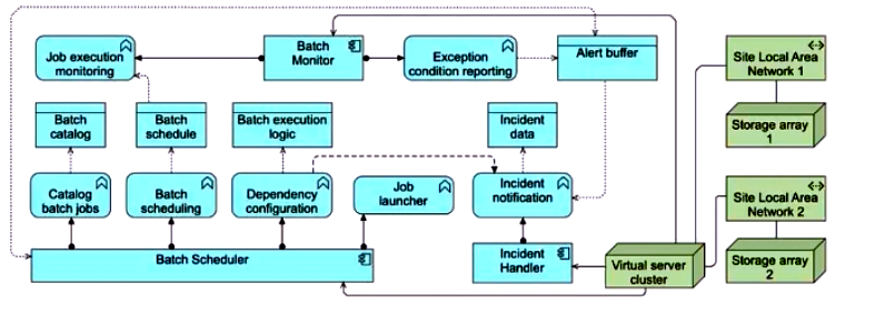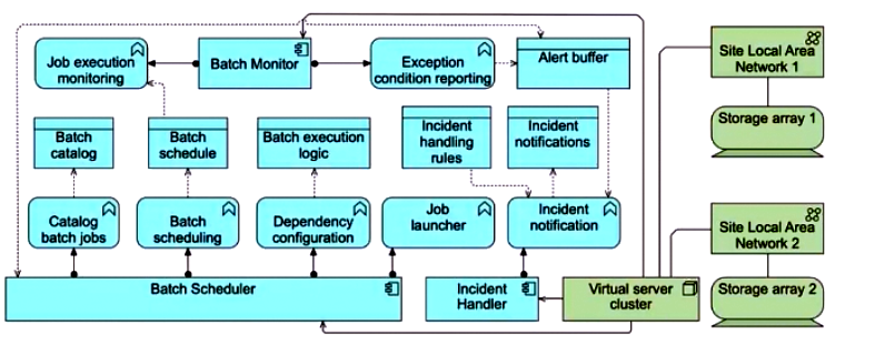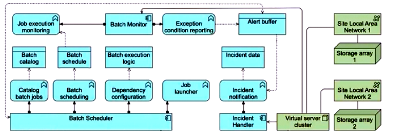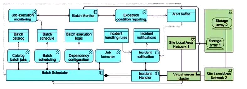 Recognizing the criticality of the Batch Scheduler, Batch Monitor, and Incident Handler applications, ArchiSurance has implemented redundant hosting arrangements across multiple geographically distributed data centers. In each data center, these three applications are supported by fully redundant virtual server clusters. Each cluster is connected to two site local area networks, both of which are further linked to separate storage array hardware devices.