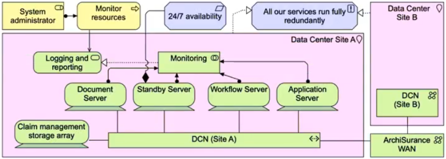 The ArchiSurance enterprise document management solution plays a crucial role in supporting a large number of document types and managing a high volume of document-based transactions each day. Given its business-critical nature, the document management solution is hosted redundantly across two geographically separate data center sites: Site A and Site B. Both sites are configured identically to ensure seamless operations.