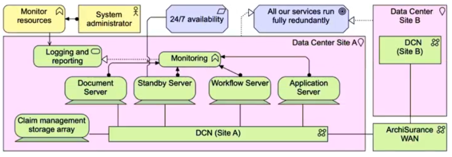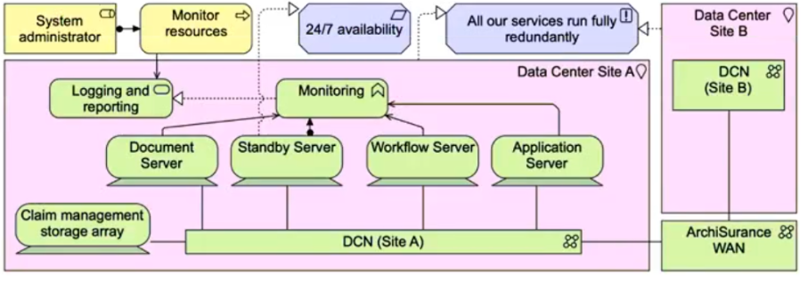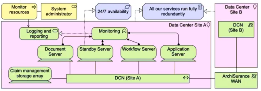 Each application service is realized by an application component with the same name. Each technology service is realized by a system software environment, having the same name. ArchiSurance hosts both the application components and system software environments in a virtualized server pool within its data center. Each service has its own virtual server. Each virtual server is connected to a data center network (DCN) which in turn connects to a commercial wide area network (WAN).