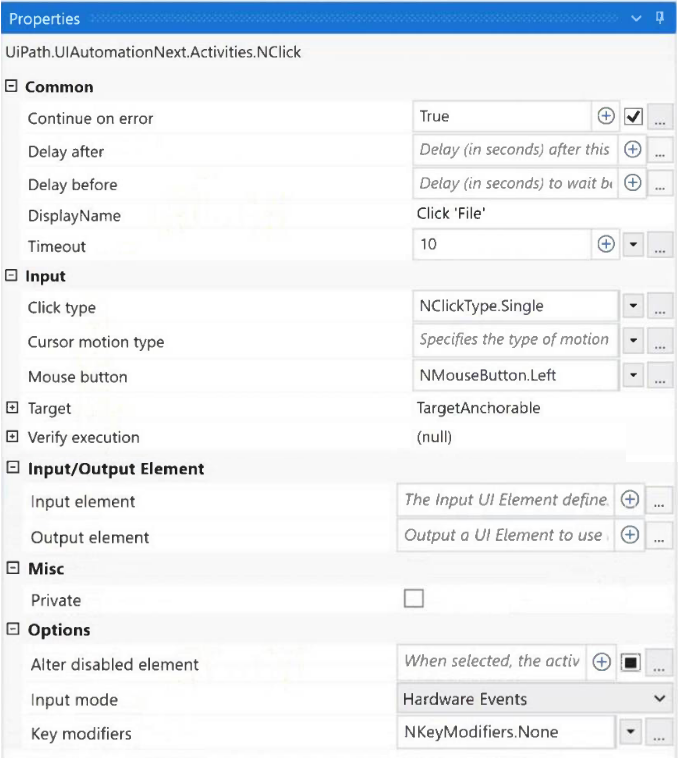 A developer configured the properties for a Click activity as shown below: