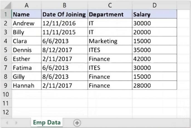 Data from an Excel file is read into a data table named "dtEmployee", as displayed in the following graphic: