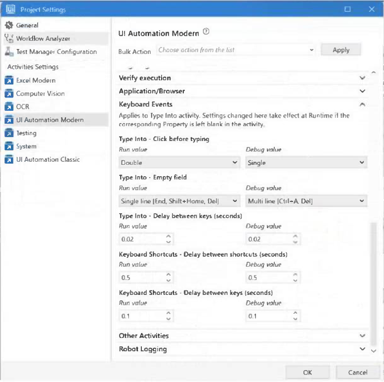 A developer is building an automation which types text into a text file. The Activity Project Settings tor UI Automation Modern activities are set as follows: