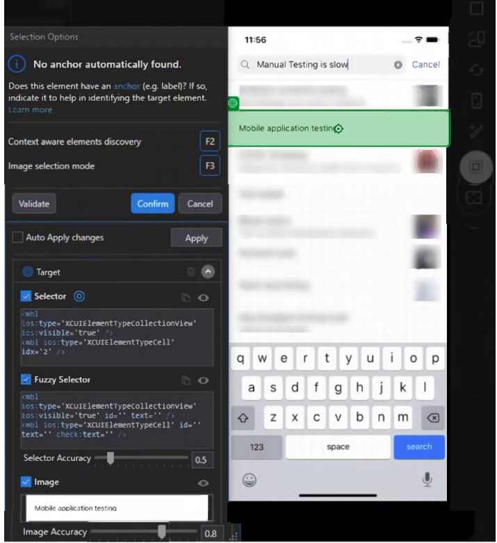 Based on the selector configuration shown in the screenshot, what role do the Selector Accuracy and Image Accuracy sliders play in UiPath’s mobile automation design?